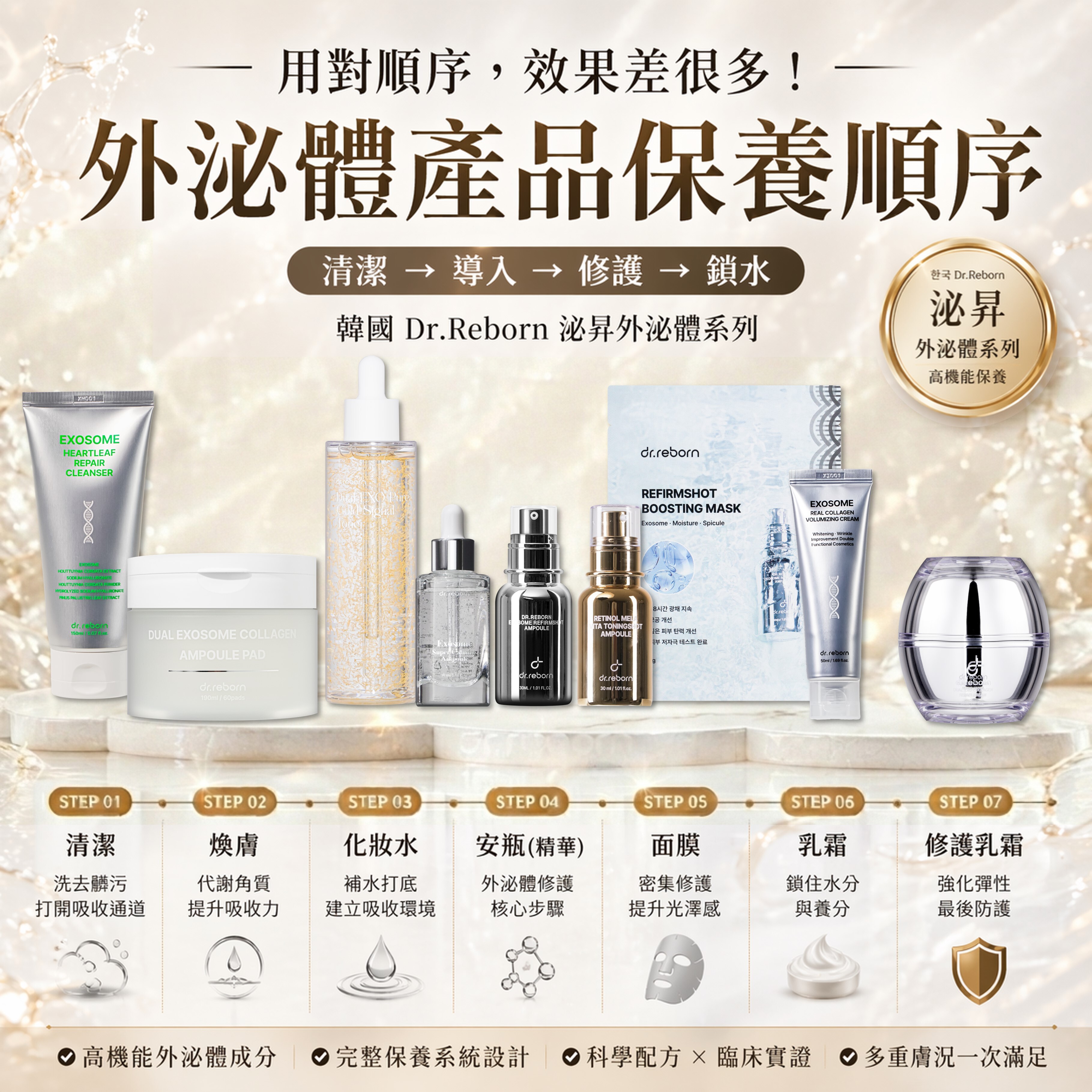 泌昇外泌體系列的臉部保養順序中,也將潔面乳、煥膚墊、化妝水、安瓶、面膜與乳霜安排成完整保養流程;其中安瓶是在化妝水之後、乳霜之前使用,符合「先補水、再加強、最後鎖水」的保養邏輯。