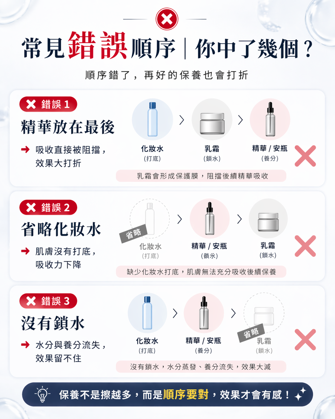 ❌ 先擦乳霜 → 再擦精華