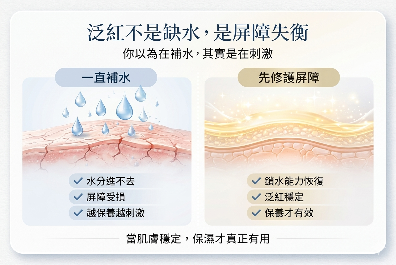 👉 大多數敏感與泛紅問題,核心不是缺水,而是「屏障受損」